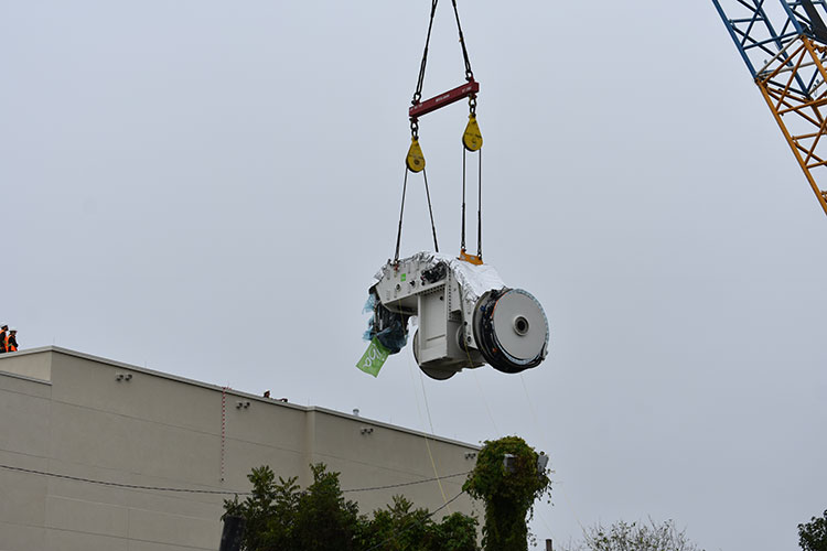 The second largest piece was delivered and installed on Tuesday, Nov. 13. It is a 55-ton cyclotron that accelerates the protons used in proton therapy.